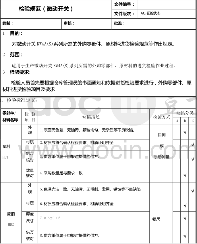 為什么要 有微動開關檢驗書呢?因為里面清晰的寫明微動開關的外觀、材質(zhì)、厚度材質(zhì)還有數(shù)量等。下面給大家分享一下微動開關進貨檢驗書: